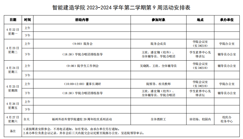 智能建造学院2023-2024学年第二学期第9周活动安排表