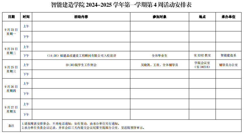 智能建造学院2024-2025学年第一学期第4周活动安排表