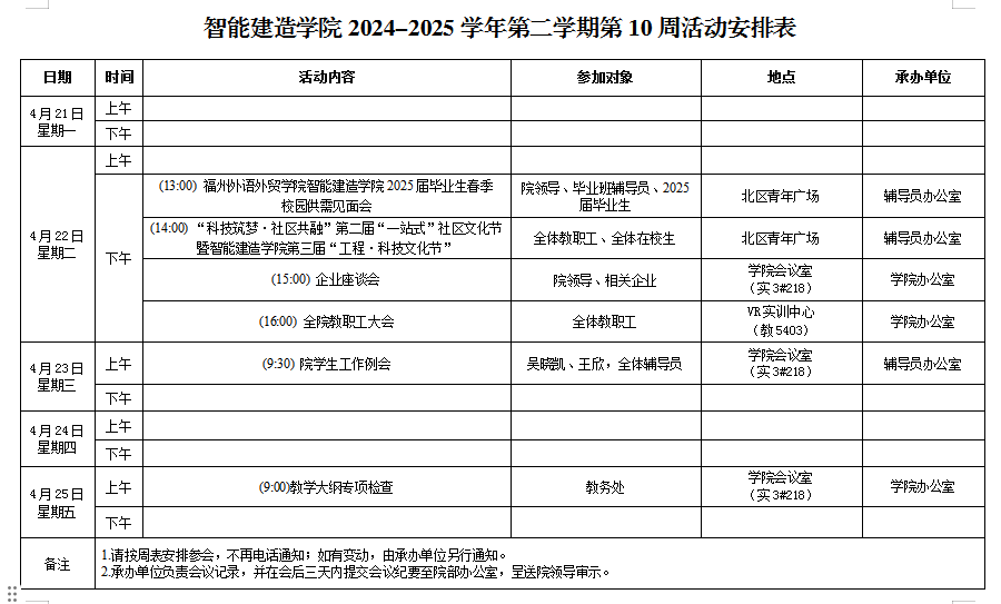 智能建造学院2024-2025学院第二学期第10周活动安排表.docx